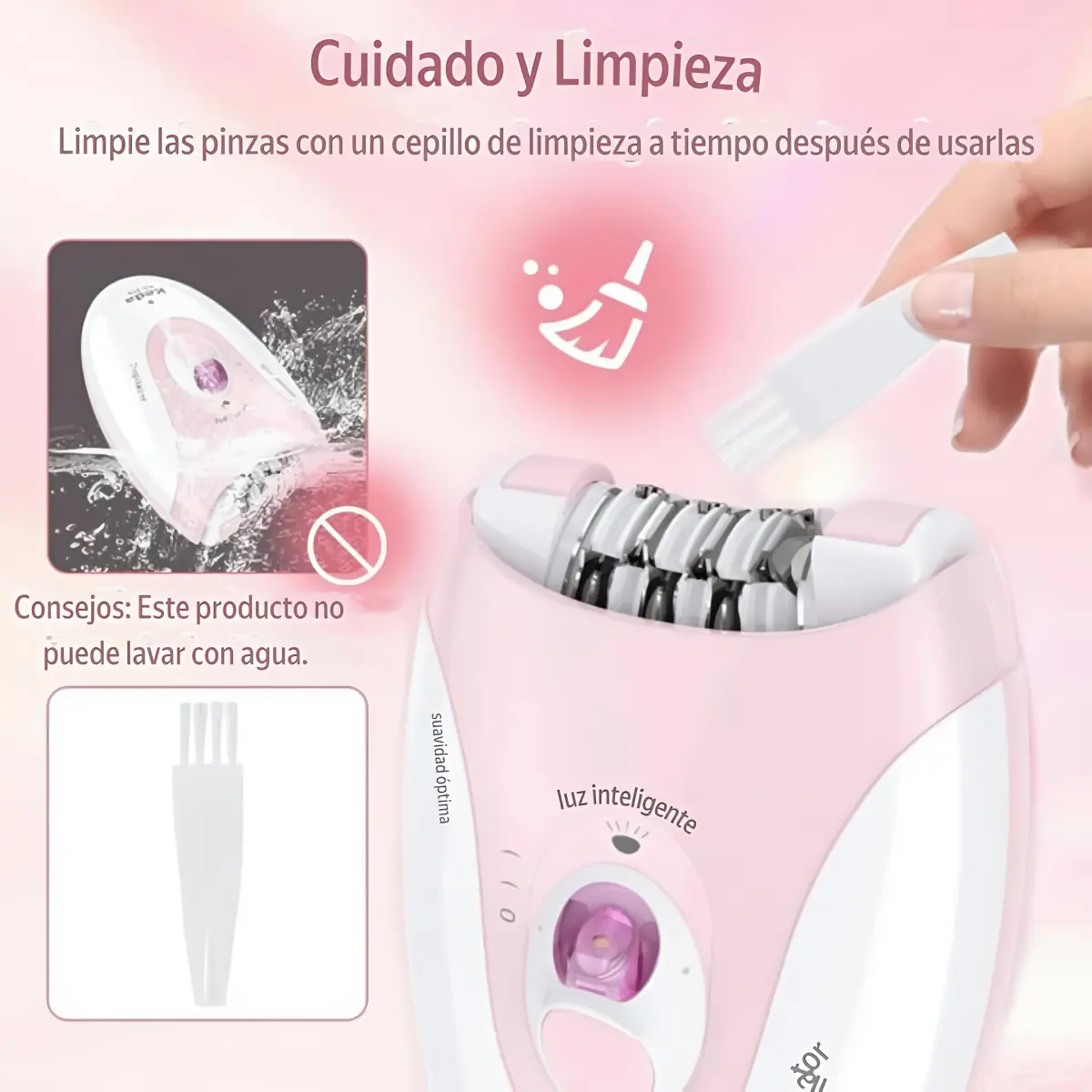 Fácil de limpiar e instalar: la depiladora para mujer también es muy cómoda de limpiar. Simplemente use el cepillo de limpieza incluido para eliminar los residuos de pelo en el cabezal de afeitado, luego límpielo suavemente con una toalla húmeda para limpiar el cuerpo (no lavar). Por favor, límpielo a tiempo después de cada uso para prolongar la vida útil del dispositivo y facilitar su próximo uso.